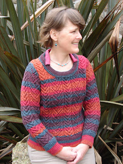 (See the collar - now imagine it with a little stripe of red before the green - it wouldn't have worked, would it?). It's always a worry as to whether stripey yarn and cables/lace are going to work but, in this instance, I think they do. Here is the picture of the pattern, in a different colourway: