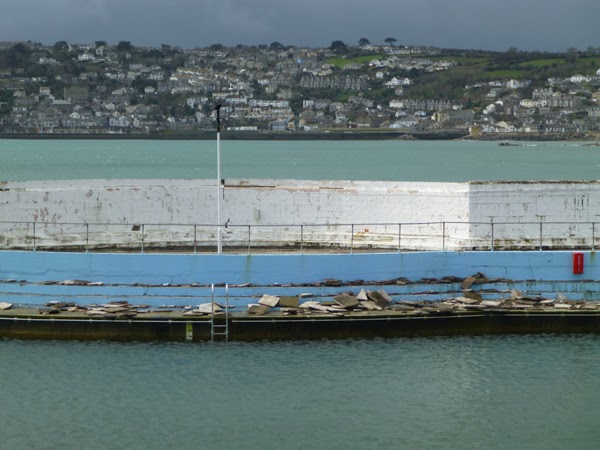 We set off at a goodly pace to Penzance, Newlyn and Mousehole (almost entirely flat for a pleasant change) with a minor pause to put on waterproofs when the heavens' opened. The poor old Jubilee Pool in Penzance is looking very battered after the recent dreadful storms. Here is their page giving information about how you can help save this iconic lido: